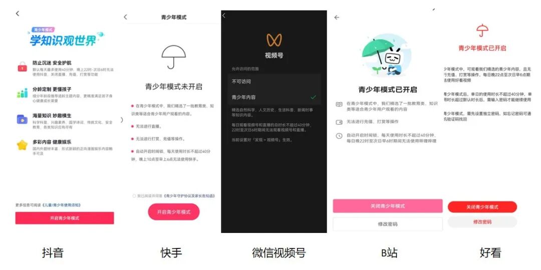 图:五大短视频平台青少年模式界面