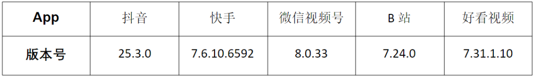 表:各App测试时版本号
