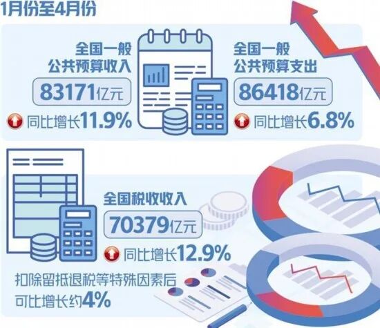 日前,财政部发布统计数据显示,1月至4月累计,全国一般公共预算收入83171亿元,同比增长11.9%;一般公共预算支出86418亿元,同比增长6.8%。总体看,财政收入延续平稳回升态势,财政支出保持较高强度。专家表示,前4个月财政收支结构进一步优化平衡,体现出财政可持续性随着经济的稳步恢复得到改善。