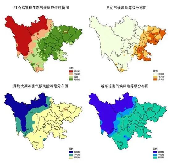 根据猕猴桃生长习性,结合四川省近40年的气象数据,分析其越冬冻害、芽膨大期冻害、日灼灾害的受灾分布时段和灾害因子,获取不同时期灾害的风险等级分布,得到猕猴桃生态气候适应性分布。