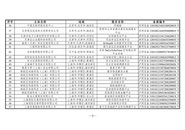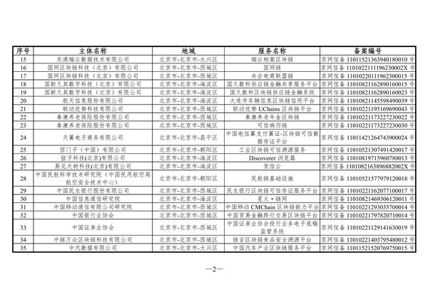 根据《区块链信息服务管理规定》(以下简称《管理规定》),国家互联网信息办公室依法依规组织开展备案审核工作,现发布第五批共223个境内区块链信息服务名称及备案编号,任何单位或个人如有疑议,请于即日起10个工作日内将相关意见通过电子邮件发送至bc_beian@cert.org.cn,或邮寄至北京市朝阳区裕民路甲3号国家互联网应急中心,邮编:100029(信封上注明“备案公告反馈”)。提出疑议应以事实为依据,并提供相关证据材料。