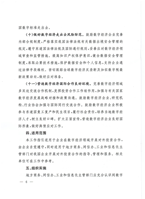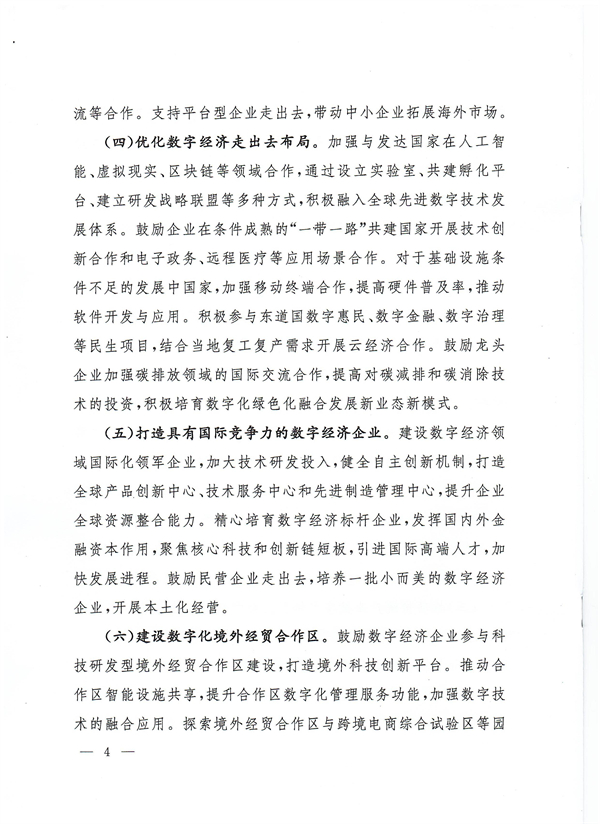 做好数字经济走出去风险防范。鼓励数字经济企业完善内部合规制度,严格落实我国法律法规有关数据出境安全管理的规定,遵守东道国法律法规及国际通行规则,妥善应对数字经济领域审查和监管措施。提高知识产权保护意识,健全数据安全管理制度,采取必要技术措施,保护数据安全和个人信息,支持企业通过法律手段维权。密切跟踪全球数字经济反垄断及加征数字税最新政策动向,做好应对准备。