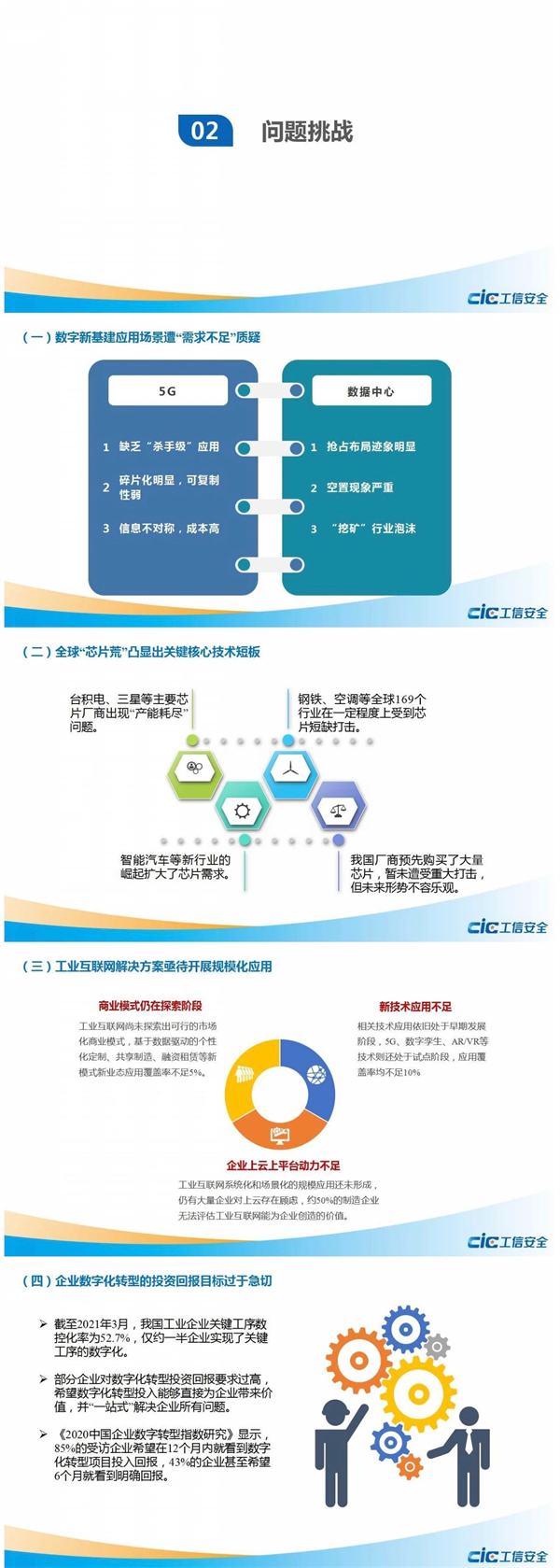 然而,我国数字经济在发展过程中也面临着问题和挑战:一是数字新基建应用场景遭“需求不足”质疑;二是全球“芯片荒”凸显出关键技术短板;三是工业互联网解决方案亟待开展规模化应用;四是企业数字化转型的投资回报目标过于急切;五是数据中心亟需自我革命解决耗能过高问题;六是全民数字素养和技能的提升已经刻不容缓;七是平台经济区域发展不平衡问题进一步凸显。