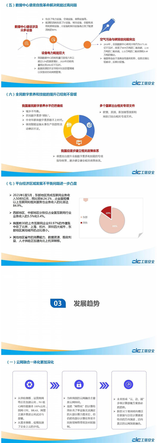 日前,国家工业信息安全发展研究中心在“工信安全智库”系列报告在线发布活动发布《2021年数字经济半年形势分析》研判报告。报告指出,数字新基建重应用,云网深度融合趋势显现;数字产业增速回升,互联网行业出现“上市潮”;数字化转型正当时,工业互联网生态更健全;数字社会发展加快,适老化改造迈入机遇期;数字政府能力提升,应急响应应用持续深化;数字生态更加健全,平台经济治理初见成效;数字低碳理念深化,高碳行业成为关注重点。