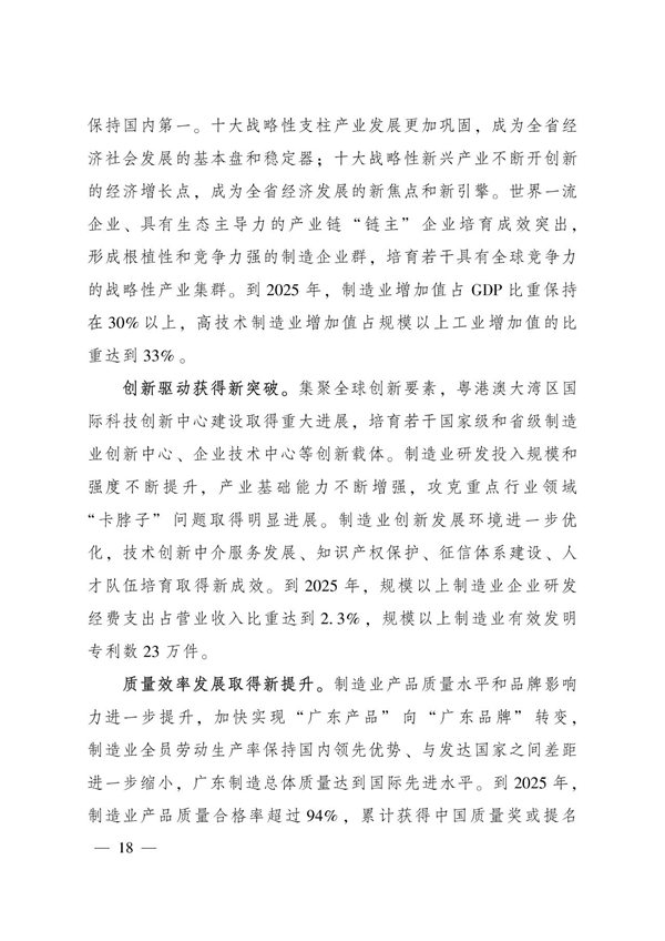 按照《规划》,到2025年,广东制造强省建设迈上重要台阶,制造业整体实力达到世界先进水平,培育形成若干世界级先进制造业集群,成为全球制造业高质量发展典范。展望2035年,关键核心技术实现重大突破,率先建成现代产业体系,制造业综合实力达到世界制造强国领先水平,成为全球制造业核心区和主阵地。