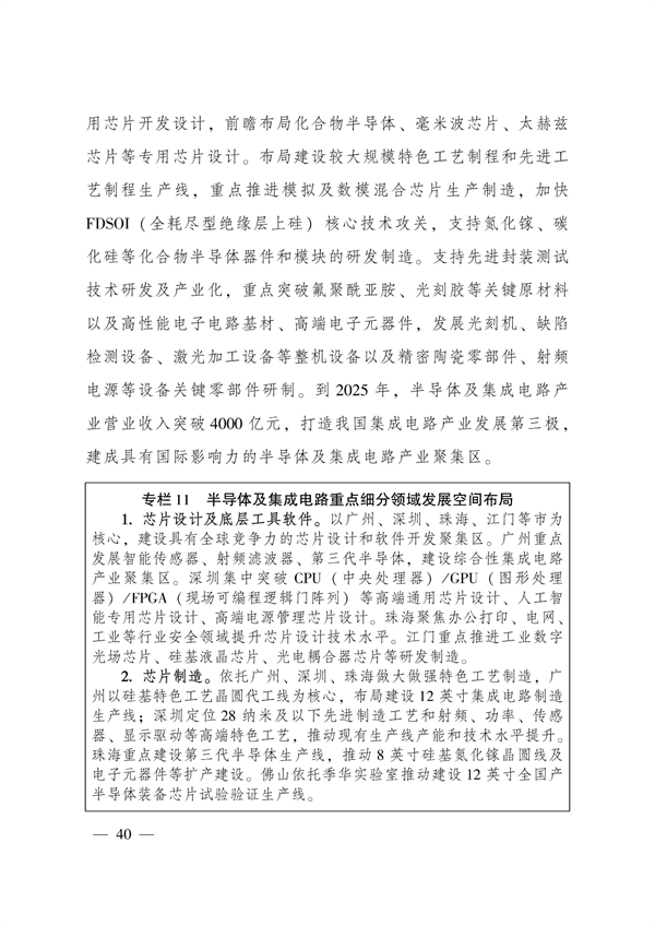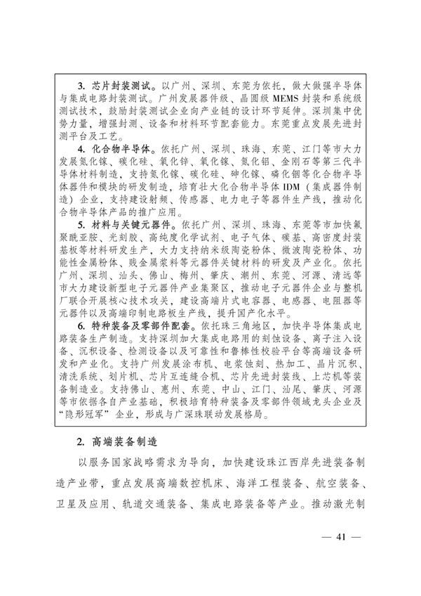 实施强核工程。构建完善全省制造业协同创新体系,打造全球重要的制造业创新聚集地。其中特别提到,要加快关键核心技术攻关,大力实施广东“强芯行动”和“铸魂工程”,加快发展集成电路、新材料、工业软件、高端装备等产业关键核心技术,以揭榜制等方式持续支持关键核心技术产业化协作攻关,着力解决“卡脖子”问题。