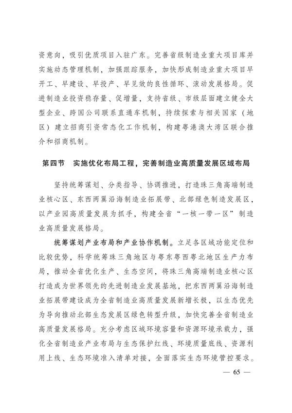 实施优化布局工程。完善制造业高质量发展区域布局,坚持统筹谋划、分类指导、协调推进,打造珠三角高端制造业核心区、东西两翼沿海制造业拓展带、北部绿色制造发展区,以产业园高质量发展为抓手,构建全省“一核一带一区”制造业高质量发展格局。