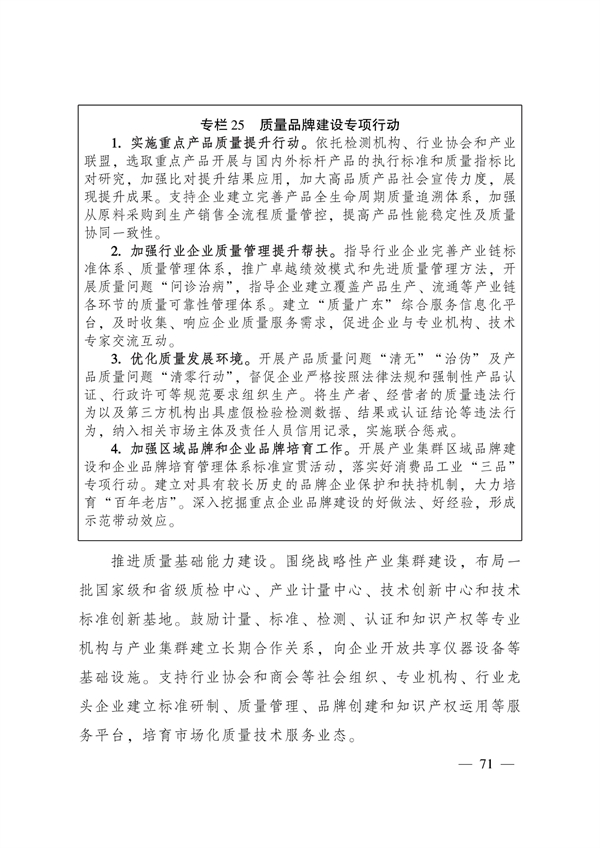 实施品质工程。提升广东制造竞争力和影响力,加快推动全省制造业品质整体升级,提升广东制造业的标准化能力和水平,提高制造业供给质量,夯实全省质量技术基础,增强“广东制造”“广东品牌”的国际竞争力和影响力。