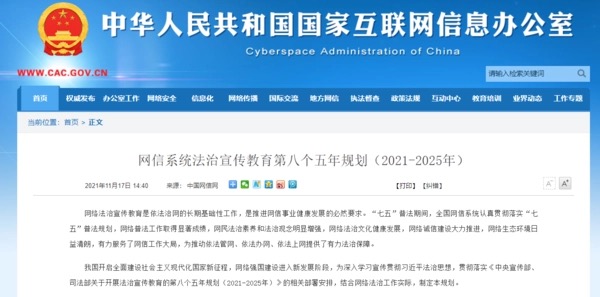 近日,中央网络安全和信息化委员会办公室印发《网信系统法治宣传教育第八个五年规划(2021—2025年)》(以下简称《规划》),对网信系 ...