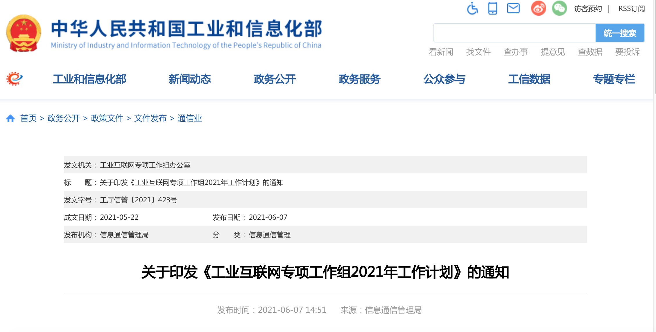 关于印发《工业互联网专项工作组2021年工作计划》的通知