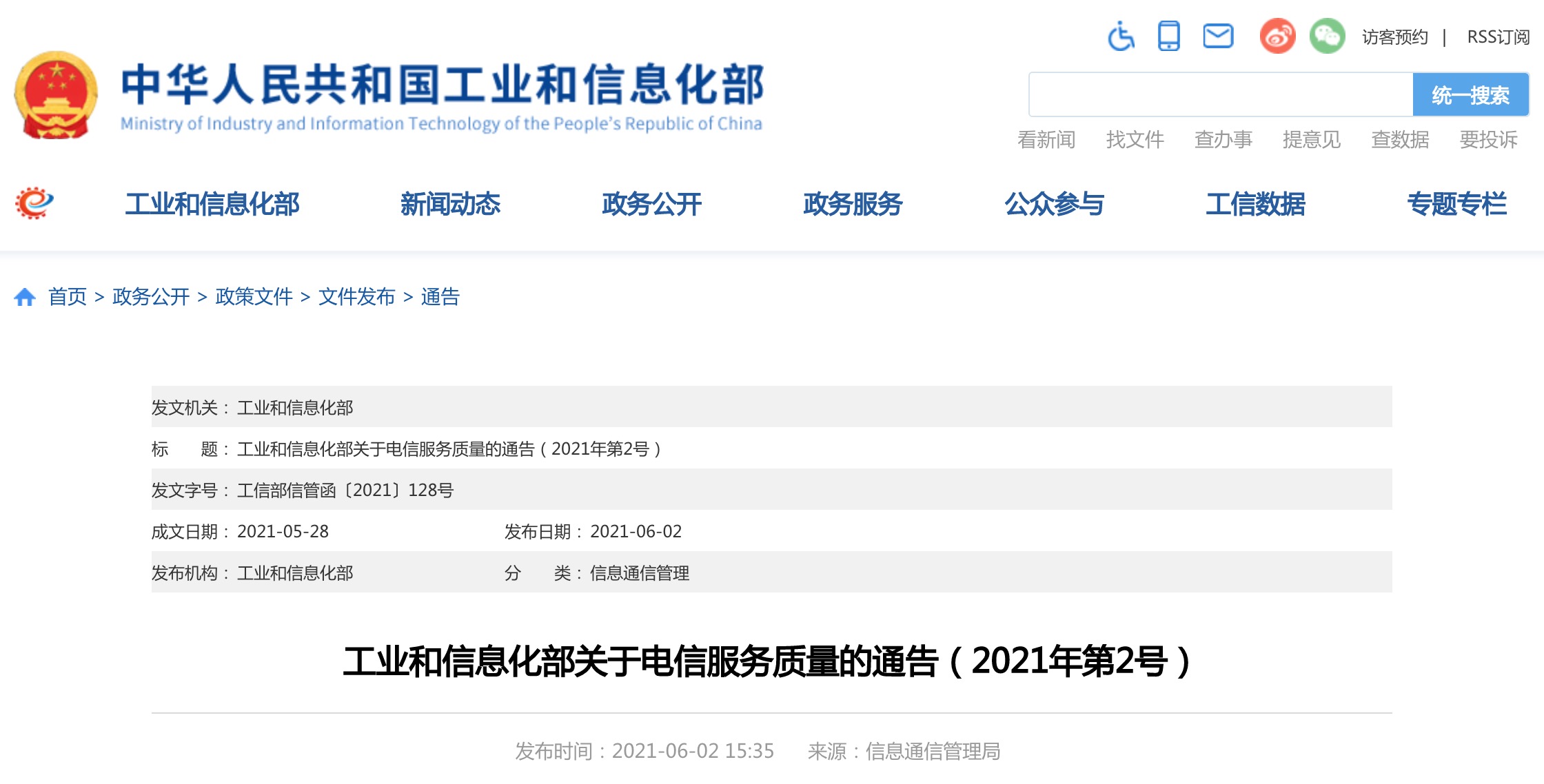 工业和信息化部关于电信服务质量的通告(2021年第2号)