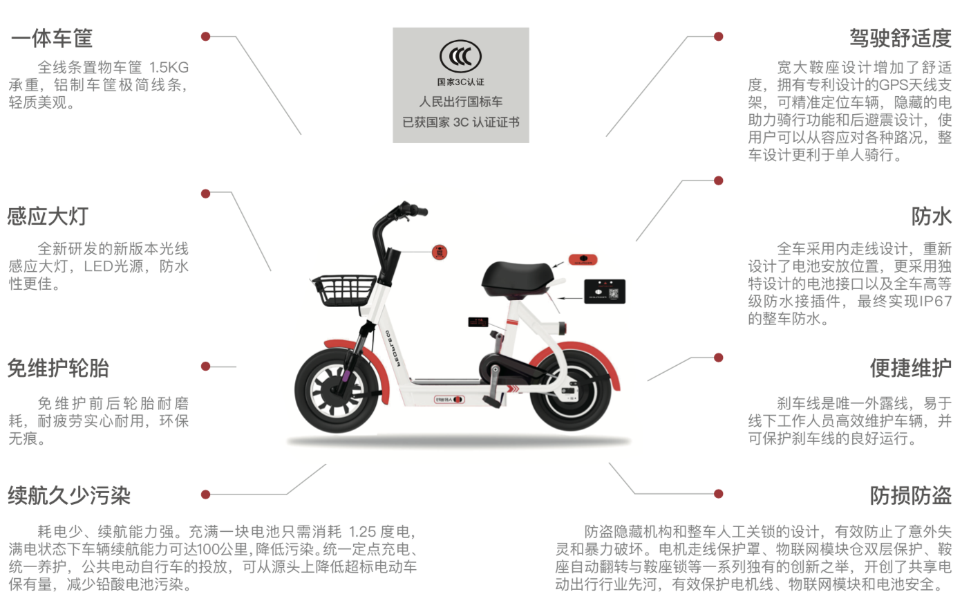 据了解,“人民出行”深耕公共电动自行车、公务电动自行车、物流电动自行车领域的建设与运营。人民数据·人民出行(5G智能出行)项目依托电动自行车“新国标”,采用高效防爆电池,利用集中充换电技术;安装北斗导航与GPS导航双定位系统,结合电子围栏技术,划定骑行区域、指定停车站点、限定禁行区域,实现90°精准垂直停车,可管可控;为每辆车购买专项骑行保险,全力保障出行安全。