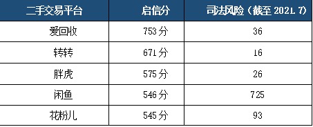 在二手平台的交易风险方面,报告引用了人民启信推出的用于评价企业信用水平的启信分。数据显示,5家二手交易平台的启信分值均在545分及以上。此外,从司法风险来看,市场占有率较高的闲鱼存在多达725条风险信息,而在垂直领域,胖虎的司法风险信息仅为26条,远低于爱回收和花粉。