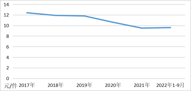 图:2017年至2022年全国快递平均单价变化情况