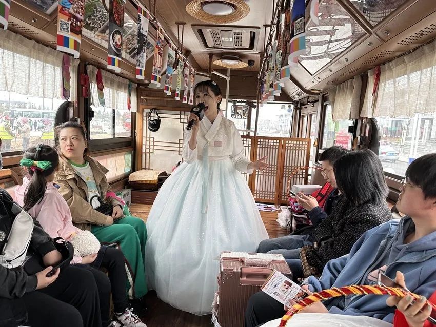 图:五一期间,延吉开通西站至延大网红弹幕墙“延吉好声音”免费专线客车。来源:人民网