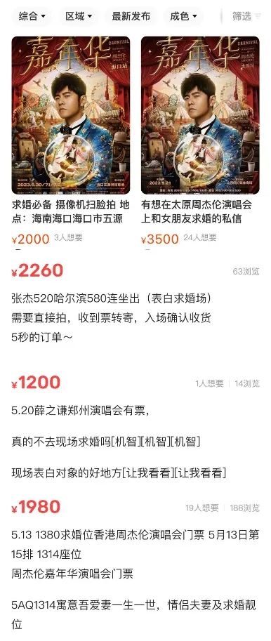 报道显示,周杰伦香港演唱会上,中5区域第15排13号、14号连座的座位,单个位置原价仅售1380港币。当黄牛打上“求婚靓位”标签后,两个座位的打包价格卖出12013元的高价。另一位售卖周杰伦太原演唱会“求婚位”的“黄牛”称,第一排中间连座的价格为17000元一张。