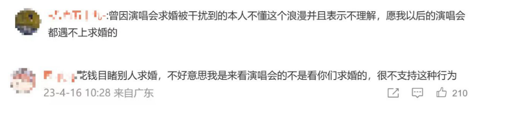 也有部分网友表示不支持现场求婚行为,认为观众现场求婚打乱了演唱会流程,影响了现场秩序会影响,给其他观众带来不好的观影体验。此前,五月天演唱会现场有情侣求婚,导致演出超时十分钟。据媒体报道,2016年,五月天在香港举行演唱会,一名男士未通知主办单位情况下,自行在现场会进行求婚,一直等到两人完成戴戒指的仪式后演唱会才得以继续。最终因超时10分钟,五月天将被罚款港币4万元(约人民币3.4万)。此后,有网友吐槽当晚求婚男子“太过自私”“不尊重演出者”。