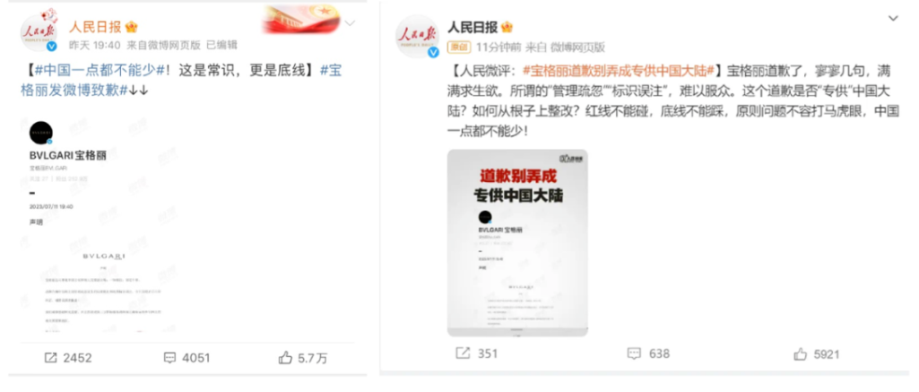对此,人民日报发布两条微博,表示“中国一点都不能少!这是常识,更是底线”“宝格丽道歉别弄成专供中国大陆!宝格丽道歉了,寥寥几句,满满求生欲。所谓的‘管理疏忽’‘标识误注’,难以服众。这个道歉是否‘专供’中国大陆?如何从根子上整改?红线不能碰,底线不能踩,原则问题不容打马虎眼,中国一点都不能少!”