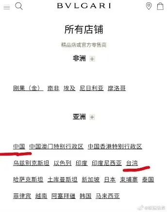 据报道,网友指出的问题并没有出现在宝格丽中国大陆官网,而是在宝格丽台湾地区和宝格丽国际官方网站上。点击这些区域性网站左上角的“寻找精品店”按键进入,都能找到”所有精品店”页面。在该页面下,宝格丽确实用中文或英文等不同语言,把台湾(Taiwan)与中国(China)、中国香港特别行政区(Hong Kong SAR China)和中国澳门特别行政区(Macao SAR China)并列显示。