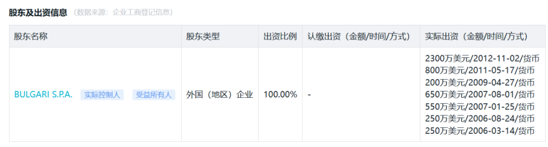宝格丽官网显示,宝格丽(BVLGARI)是意大利奢侈品品牌,由帝里欧·宝格丽(Sotirio Bulgari)于1884年在罗马创立,现属LVMH集团。宝格丽旗下产品包括珠宝、腕表、包袋与配饰、香水、酒店等。宝格丽国内关联公司为宝格丽商业(上海)有限公司。人民数据资产服务平台显示,该公司成立于2006年1月26日,法定代表人为THIERRY PIERRE JACQUES DURAND,公司类型为有限责任公司(外国法人独资),注册资本为8000万美元,由BULGARI S.P.A.全资控股。