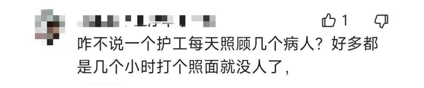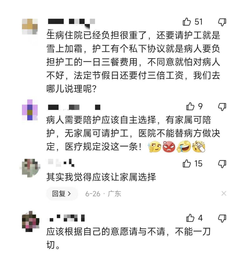 也有网友评论称,看病本身是一项大的经济支出,请护工又是一笔不小的开支,变相加重患者经济负担。病人家属照顾贴心和细致,不仅有利于病人康复,还能减轻患者经济支出。