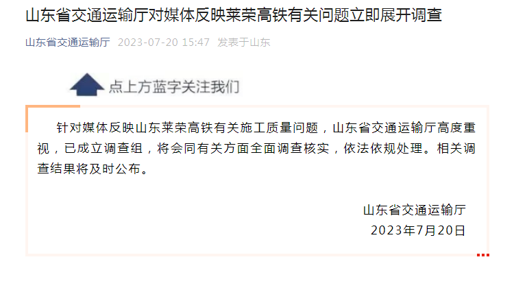 7月20日下午15时许,山东省交通运输厅公众号发文称,针对媒体反映山东莱荣高铁有关施工质量问题,山东省交通运输厅高度重视,已成立调查组,将会同有关方面全面调查核实,依法依规处理。相关调查结果将及时公布。