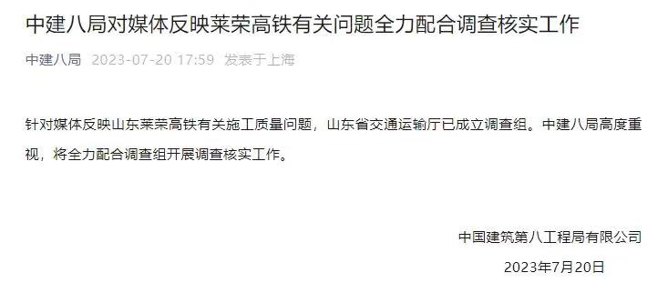 7月20日,@中建八局 官方微博发布消息称, 针对媒体反映山东莱荣高铁有关施工质量问题,山东省交通运输厅已成立调查组。中建八局高度重视,将全力配合调查组开展调查核实工作。
