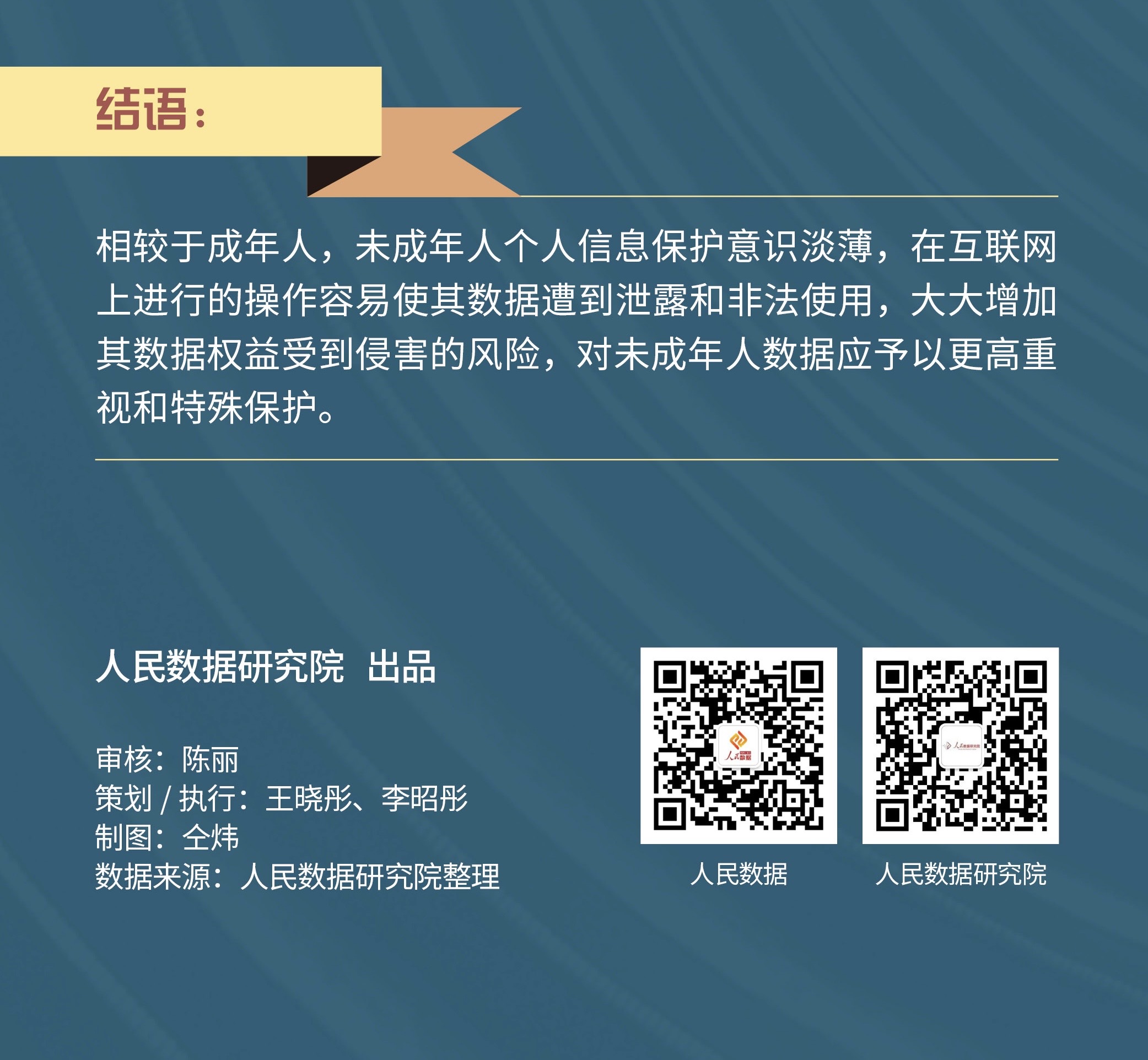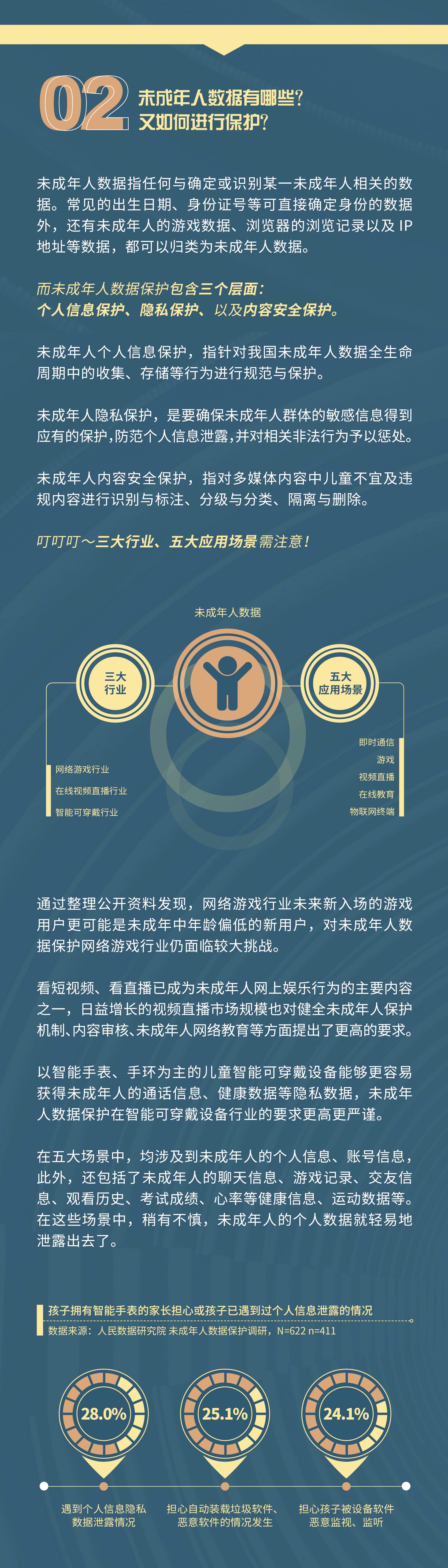 数字时代,相较于成年人,未成年人普遍缺乏对个人信息数据、隐私数据、内容安全等自主保护意识、能力与手段,在互联网上进行的操作容易使其数据遭到泄露和非法使用,大大增加其数据权益受到侵害的风险。随着我国未成年人互联网普及率的提高,进一步重视和加强未成年人数据的特殊保护是紧迫且必要的。人民数据研究院《2023 我国未成年人数据保护蓝皮书》发布,从个人信息保护、隐私保护、内容安全保护三个层面来探讨未成年人数据的规范与保护,并列举出最需要进行未成年人信息保护的三大行业、五大应用场景,旨在促进未成年人身、心、智健康发展,切实保障未成年人群体数据权益。