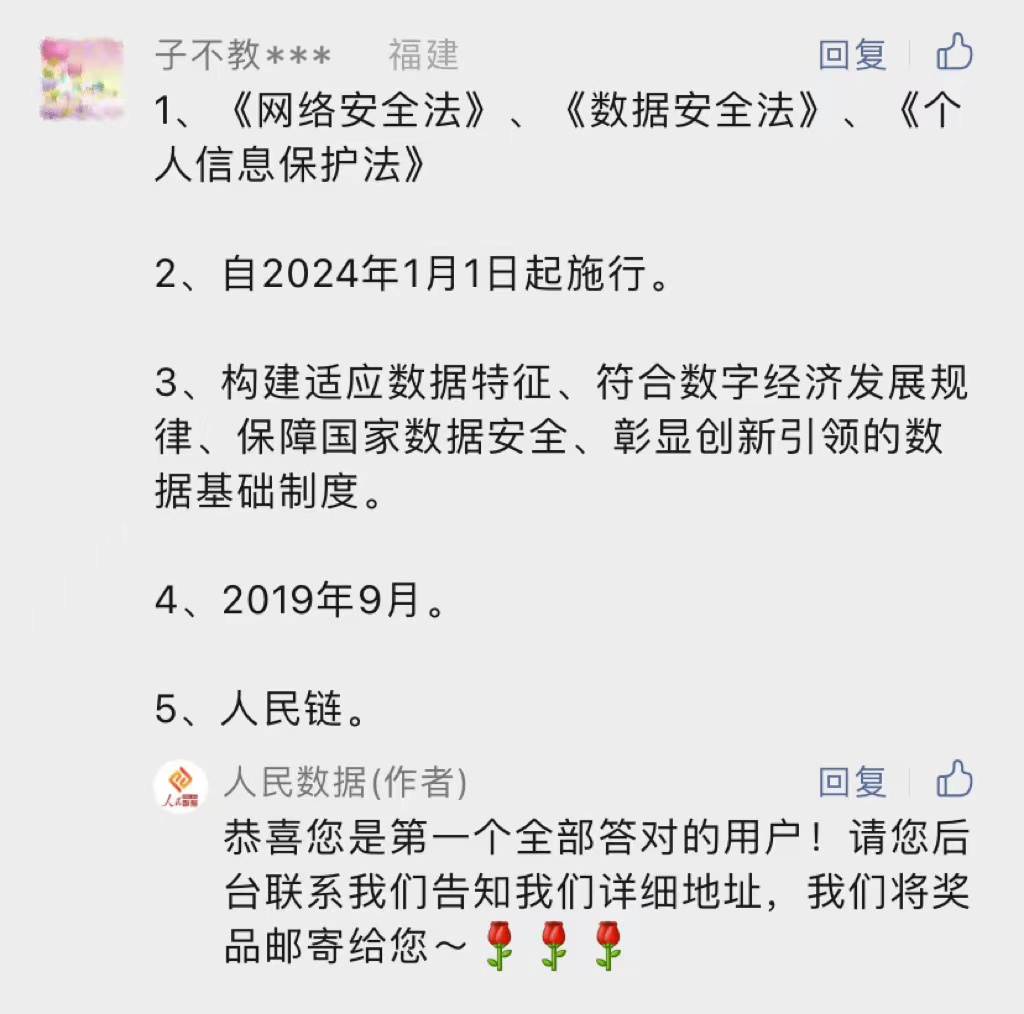 为深入推进数据相关知识科普,提高对数据的认识和理解,助力加快构建全民数字素养与技能发展培育体系,促进数字化发展成果更好支撑经济社会发展和民生福祉增进,人民数据特别推出“数据要素知多少”有奖问答活动,赶紧叫上小伙伴一起参加吧~