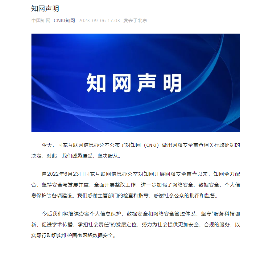 国家网信办9月6日消息,对知网(CNKI)依法作出网络安全审查相关行政处罚的决定,责令停止违法处理个人信息行为,并处人民币5000万 ...