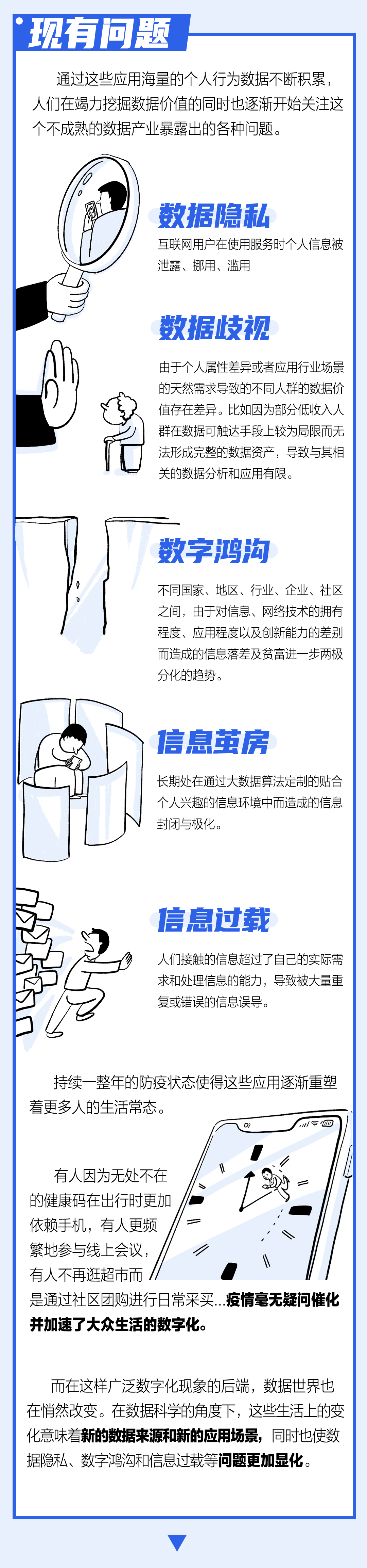 从早期的应用尝试,到疫情的意外推动,再到当下政策和技术的大力驱动,生活的全面数字化已成为不可逆的趋势。而在加速走向数字时代的同时,需要注意的是:如何把控对信息茧房和数据杀熟等前方风险、如何消除数据安全等沿途隐患,以及如何关照来不及跟上时代步伐的人们。真正“全面数字化”的达成需要我们有节制地应用数据和技术,使每个人都能成为数据的生产者、治理者、使用者和获益者。