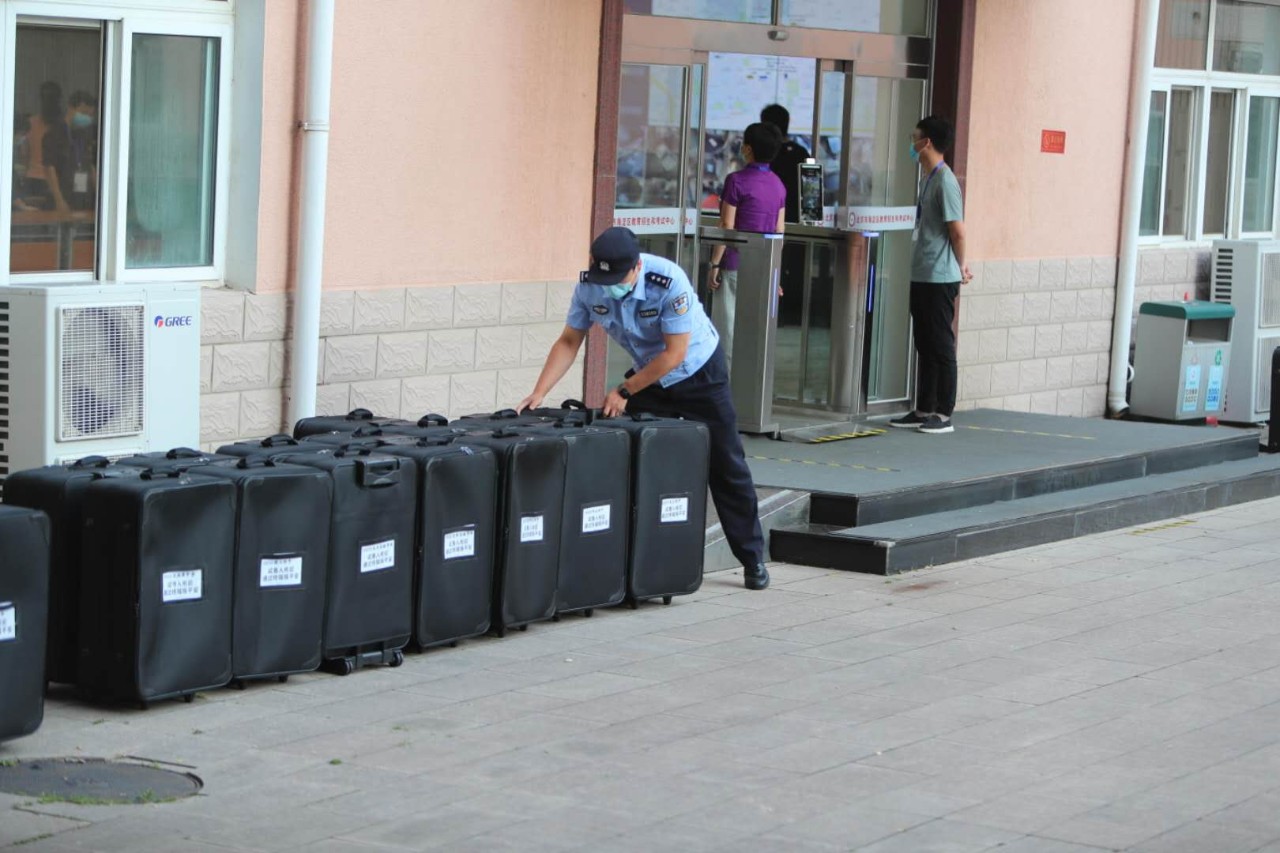工作人员将装有考卷的行李箱搬上车