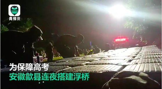 歙县人武部副部长徐国友昨晚表示,“整个安排了民兵是44人,重点就是搭两座浮桥,保障明天两个考场正常的通过,一个是保障歙县一中和保障歙县二中两个地方。”