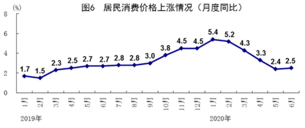 第二,就业物价总体平稳。6月份全国城镇调查失业率为5.7%,连续两个月小幅下降,其中25-59岁群体人口调查失业率为5.2%,比全国城镇调查失业率低0.5个百分点。6月份,全国企业就业人员周平均工作时间为46.8小时,比上个月上升0.7小时。居民消费价格涨幅呈现趋势回落,上半年,居民消费价格同比上涨3.8%,涨幅比一季度回落1.1个百分点;核心CPI同比上涨1.2%,基本保持稳定。6月份,居民消费价格上涨2.5%,处于温和上涨区间。