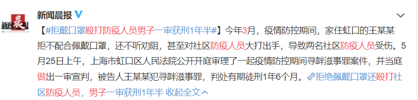 今年3月,疫情防控期间,家住上海虹口的王某某拒不配合佩戴口罩,还不听劝阻,甚至对社区防疫人员大打出手,导致两名社区防疫人员受伤。5月25日上午,上海市虹口区人民法院公开开庭审理了一起疫情防控期间寻衅滋事罪案件,并当庭做出一审宣判,被告人王某某犯寻衅滋事罪,判处有期徒刑1年6个月。