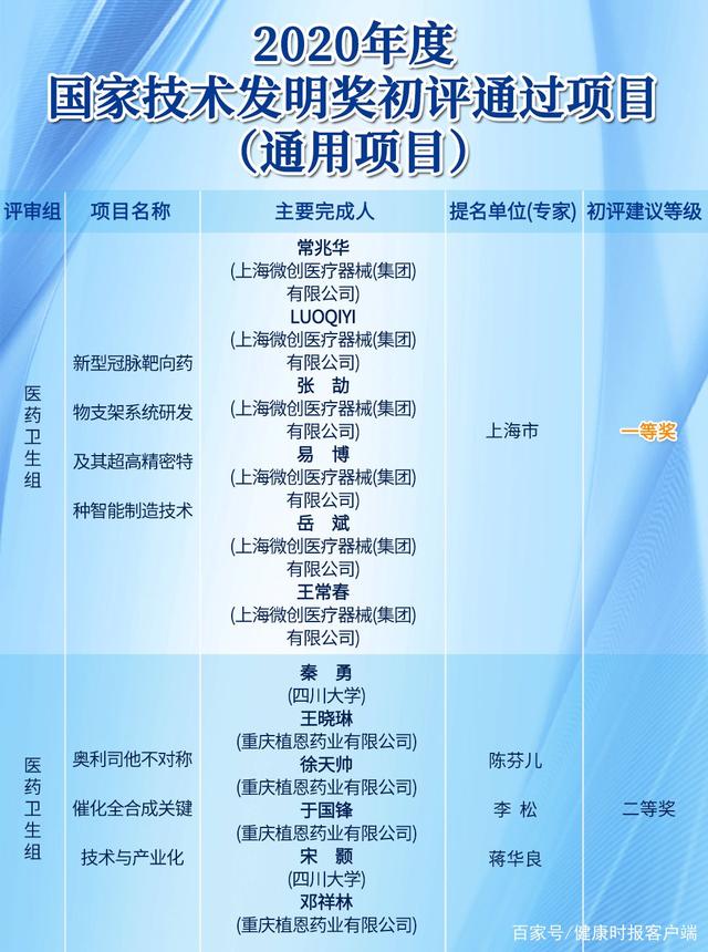 其中,值得一提的是,与新冠肺炎相关的,上海微创医疗器械(集团)有限公司的项目《新型冠脉靶向药物支架系统研发及其超高精密特种智能制造技术》通过了2020年度国家技术发明奖初评,建议等级为一等奖。