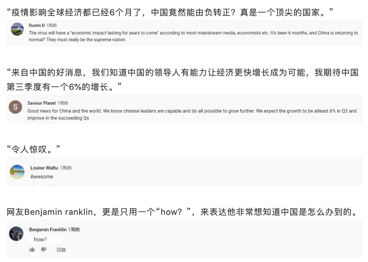 “疫情影响全球经济都已经6个月了,中国竟然能由负转正?真是一个顶尖的国家。”