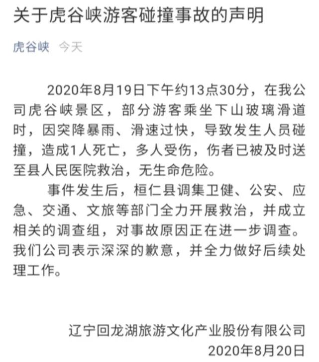 8月20日中午,景区发布通报称,2020年8月19日下午约13点30分,在我公司虎谷峡景区,部分游客乘坐下山玻璃滑道时,因突降暴雨、滑速过快,导致发生人员碰撞,造成1人死亡,多人受伤,伤者已被及时送至县人民医院救治,无生命危险。