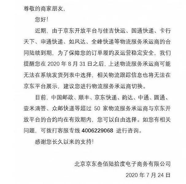 京东在商家论坛上发布《关于合作快递服务调整的通知》称,由于京东开放平台与佳吉快运、国通快递、卡行天下、申通快递、如风达、全峰快递等物流服务承运商合同陆续到期。提醒商家8月31日之后,上述物流服务承运商可能无法在系统发货列表中选择,建议切换快递公司。