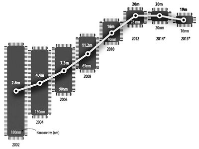 为了衡量芯片的技术进步,行业内用了“制程”这个概念,随着芯片上晶体管的尺寸减小,制程也就越小,芯片上能容纳的晶体管数量就越多,也就是说制程越小,芯片的性能就越好。