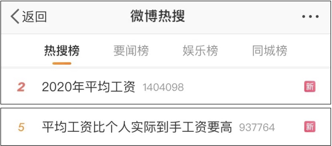 5月19日,国家统计局刚发布2020年平均工资数据,多个话题就冲上热搜↓