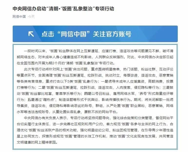 据网信中国官微消息,一段时间以来,“饭圈”粉丝群体在网上互撕谩骂、应援打榜、造谣攻击等问题屡见不鲜,破坏清朗网络生态,对未成年人身心健康造成不利影响,人民群众反映强烈。对此,中央网信办决定即日起在全国范围内开展为期2个月的“清朗·‘饭圈’乱象整治”专项行动。