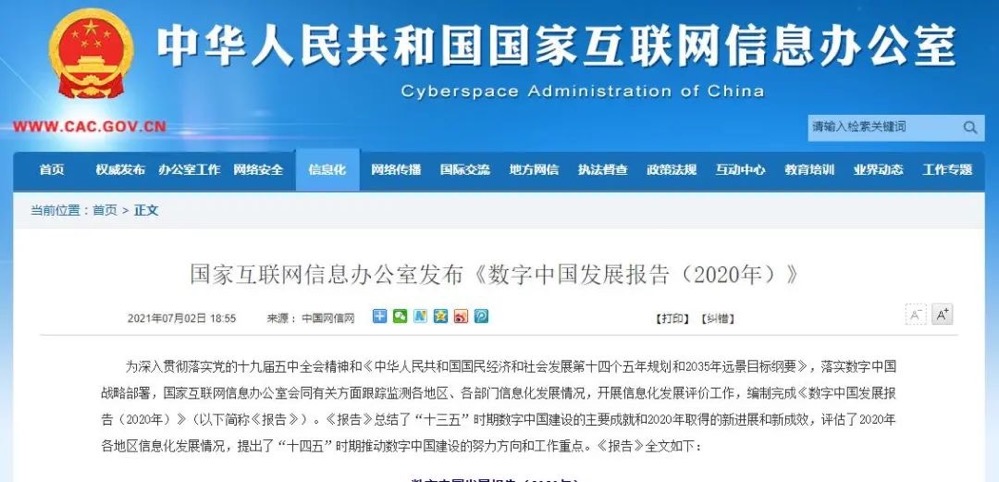 日前,为深入贯彻落实党的十九届五中全会精神和《中华人民共和国国民经济和社会发展第十四个五年规划和2035年远景目标纲要》,落实数字中国战略部署,国家互联网信息办公室会同有关方面跟踪监测各地区、各部门信息化发展情况,开展信息化发展评价工作,编制完成《数字中国发展报告(2020年)》(以下简称《报告》)。