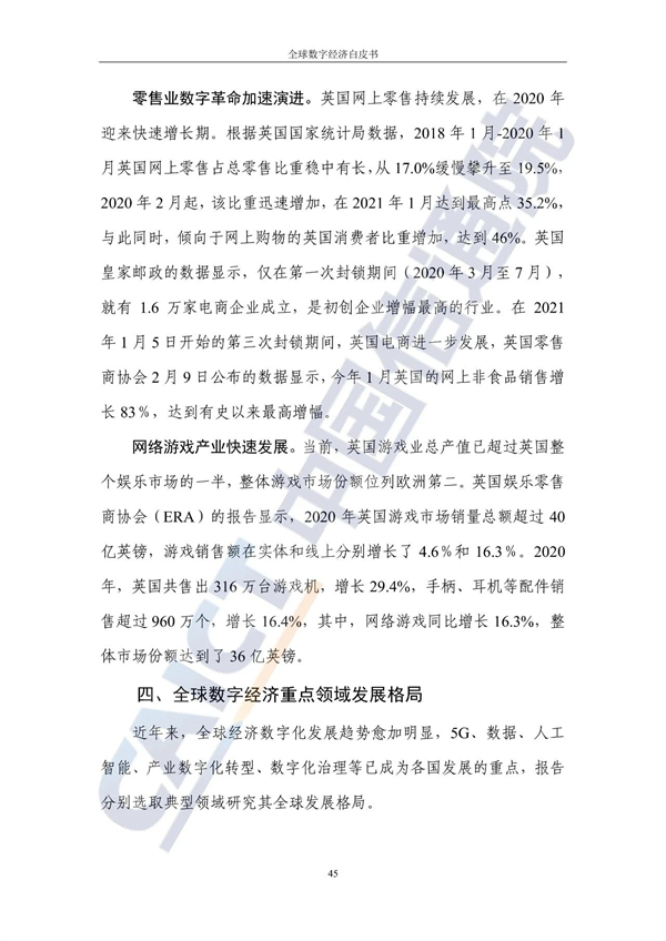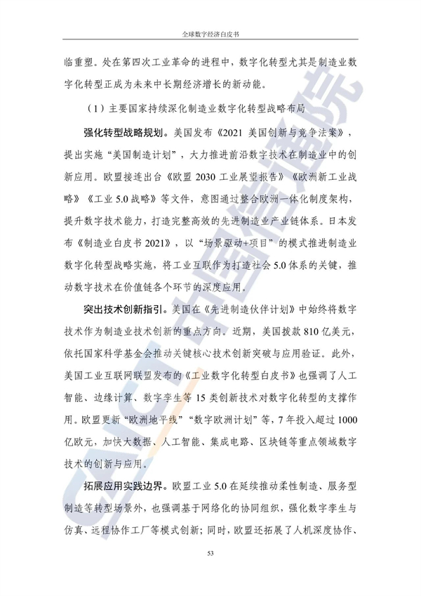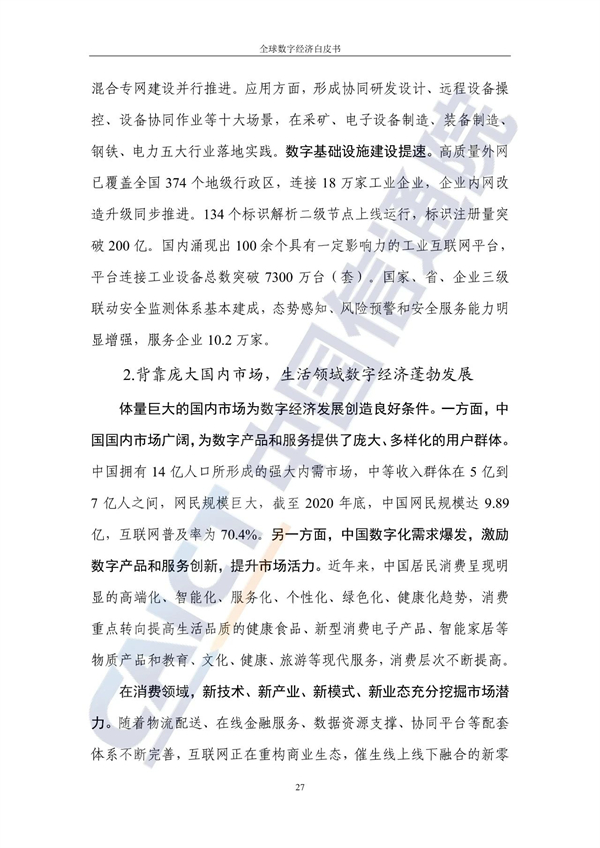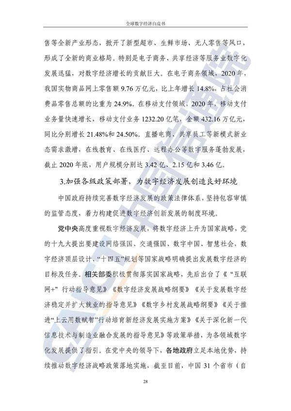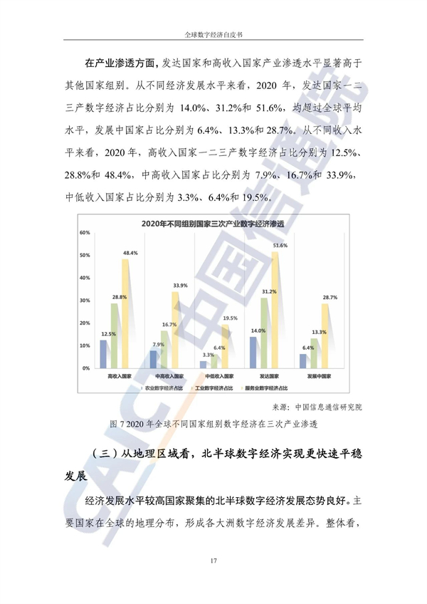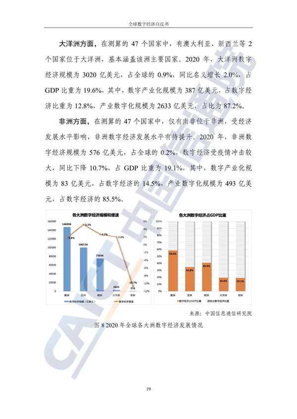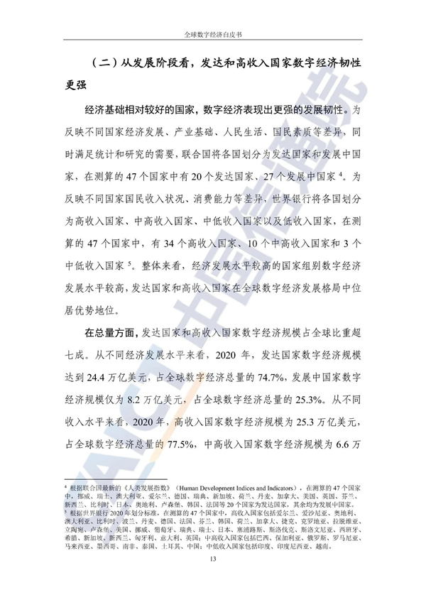 从不同经济发展水平看,20个发达国家的数字经济规模为24.4万亿美元增长3%,占GDP比重54.3%,明显优于27个发展中国家。