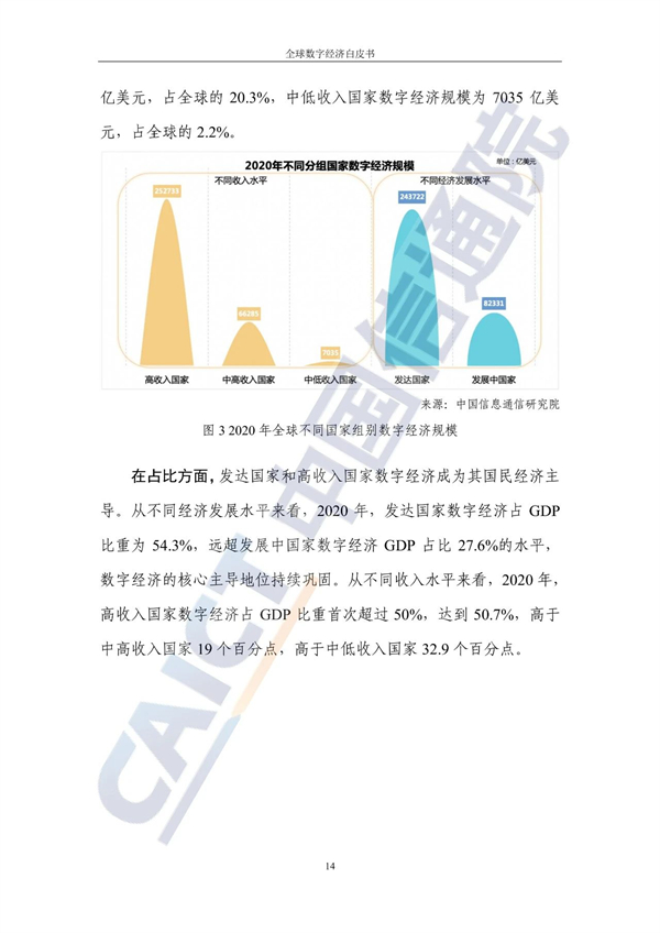 而从不同收入水平看,34个高收入国家的数字经济规模为25.3万亿美元增长2.8%,占GDP比重为50.7%,也优于10个中高收入国家和3个中低收入国家的水平。