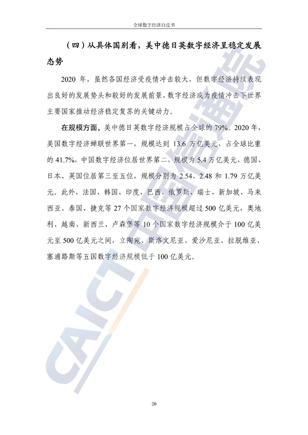 从规模看,美国数字经济继续蝉联世界第一,2020年规模接近13.6万亿美元,中国位居世界第二,规模逼近5.4万亿美元。德国、日本、英国位居第三至五位,规模分别约为2.54、2.48和1.79万亿美元。