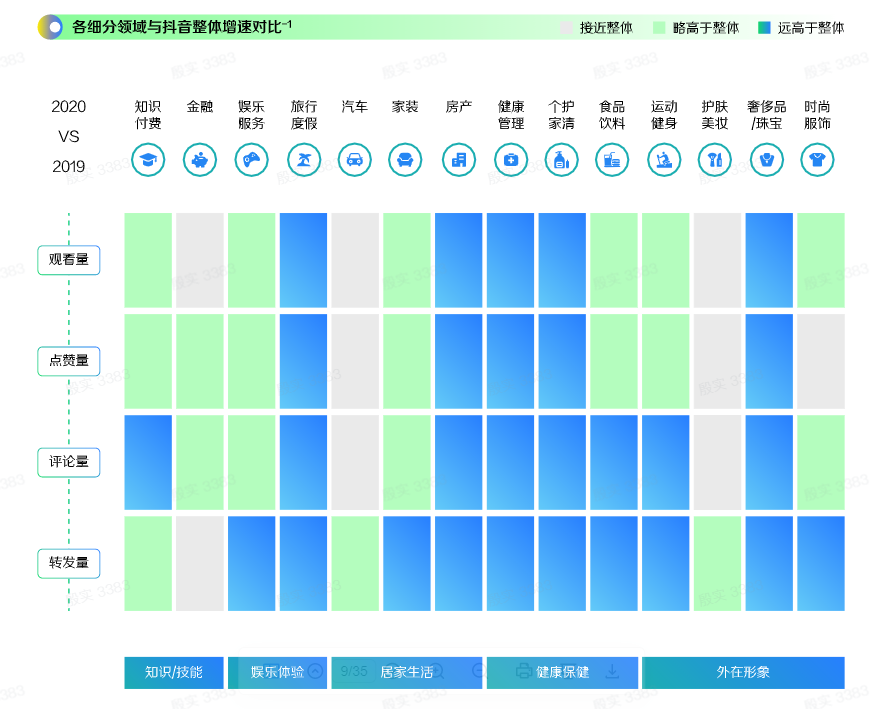 从抖音互动数据来看,各细分领域内容获得的评论和转发量都在稳步增长,体现出消费者将形象提升渗入生活,形成社交习惯的趋势,特别是运动健身板块,内容浏览量、评论和分享增长均在高位。人们不仅从物质层面追求光鲜亮丽,而更多开始注重健康的体态和生活方式。
