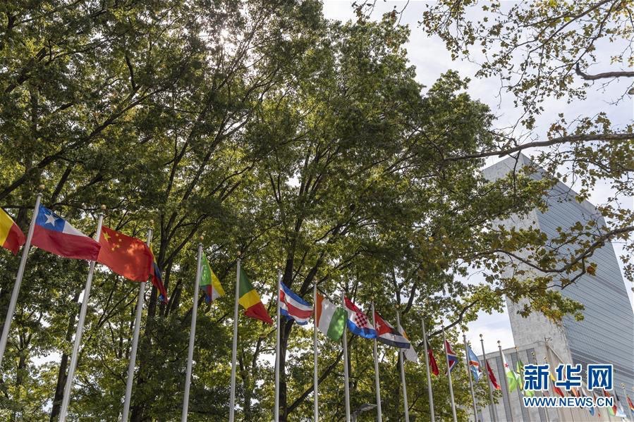 资料图五星红旗与其他国家的国旗飘扬在纽约联合国总部大楼外。在14日举行的联合国经社理事会可持续发展高级别政治论坛部长级会议上,联合国 ...