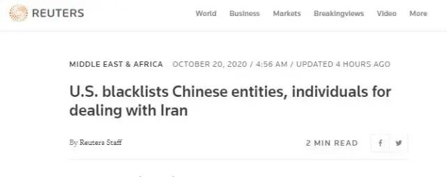 据路透社20日消息,美国国务院当地时间19日宣布将2名中国人和6家中国企业列入黑名单,声称前者与伊朗伊斯兰共和国航运公司(IRISL)打交道, ...