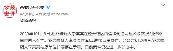 2020年10月19日,犯罪嫌疑人李某某在西安经开辖区内连续制造两起凶杀案,分别致原单位两人死亡。犯罪嫌疑人李某某作案后,跳楼自杀身 ...